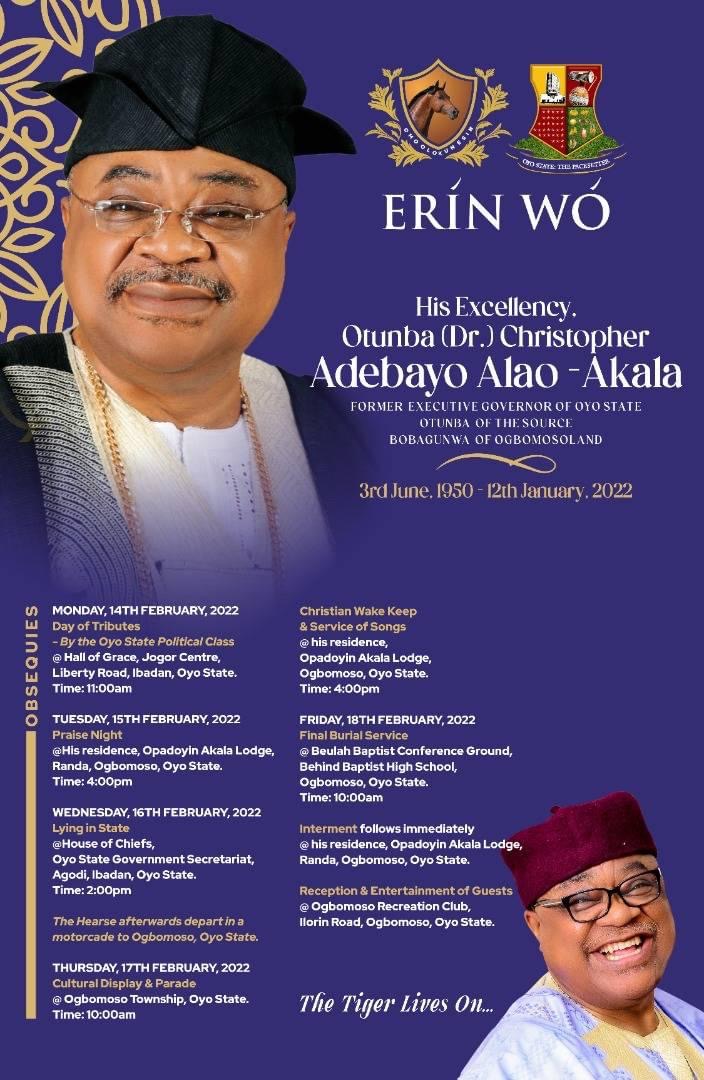 The family of the late former Governor of Oyo state Otunba Christopher Adebayo ALAO Akala has released the burial program of the elder stateman and political titan.