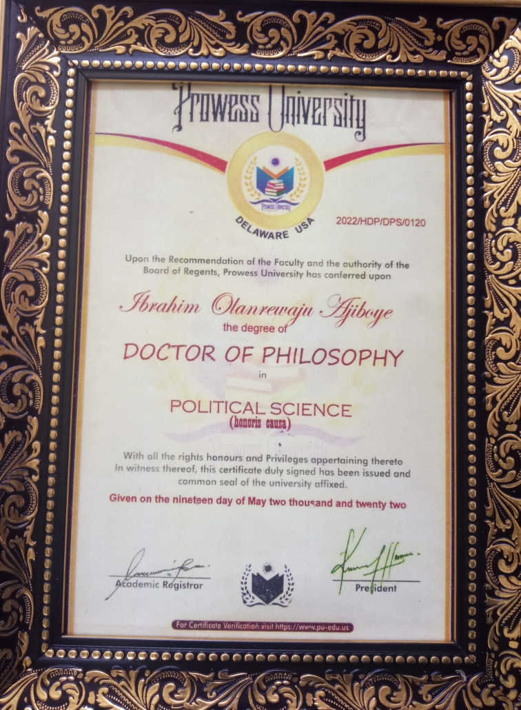New Nigerian People’s Party (NNPP) federal House of Representatives candidate for Ibadan Northeast, Southeast constituency, Ibrahim Ó. Ajiboye ” Omo Iya Eleja ” was one of the nine Nigerians bestowed with the ‘Honoris Causa’ award by Prowess University, a distinguished award held at Otunba Balogun Subomi Conference Centre, University of Ibadan.