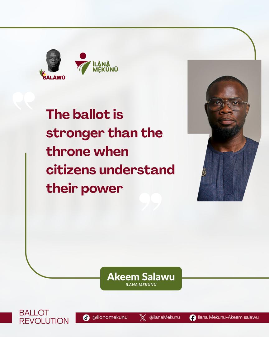 A civic advocate, Akeem Salawu, has emphasised the need for greater voter awareness and participation, stating that the true strength of democracy lies in the power of the electorate rather than political office holders. Salawu, who is the convener of Ilana Mekunu, noted that while positions of authority may appear dominant, they are ultimately sustained by the will of the people expressed through the ballot.