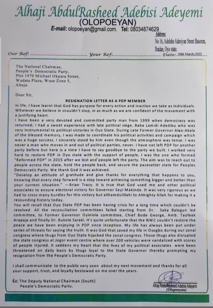 A chieftain of People’s Democratic Party ( PDP ) in Oyo State Alhaji Adebisi AbdulRasheed Adeyemi Olopoeyan, has resigned from the party.
