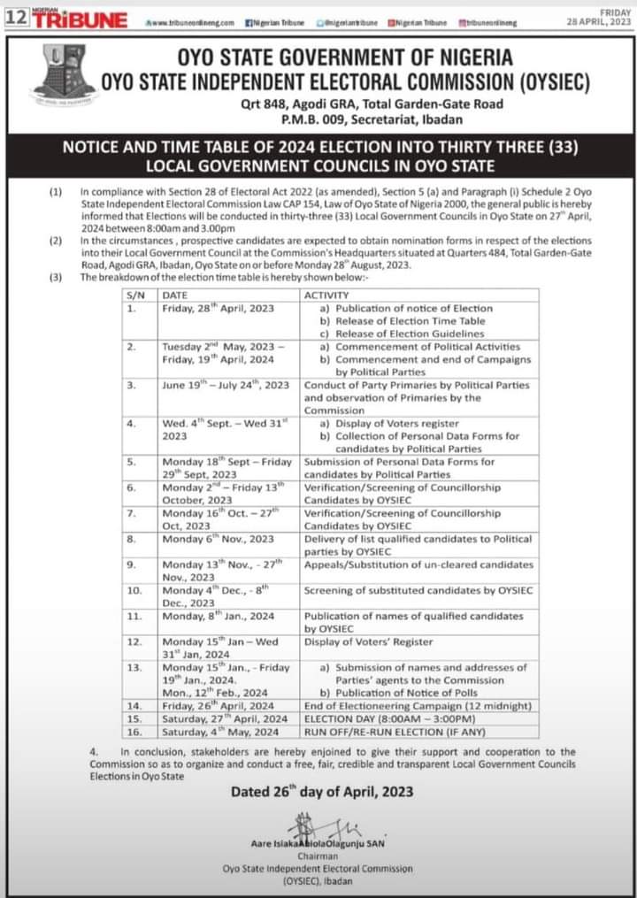 In compliance with Section 30 of Electoral Act 2010 (as amended), Section 5 (a), and Paragraph 1 (1) Schedule 2 of the State Independent Electoral Commission Law CAP 154, Laws of Oyo State of Nigeria 2000, the general public is hereby informed that Elections will be conducted in thirty-three (33) Local Government Councils in Oyo State on SATURDAY, 27th April 2024 between 8:00 a.m. and 3.00 p.m.
