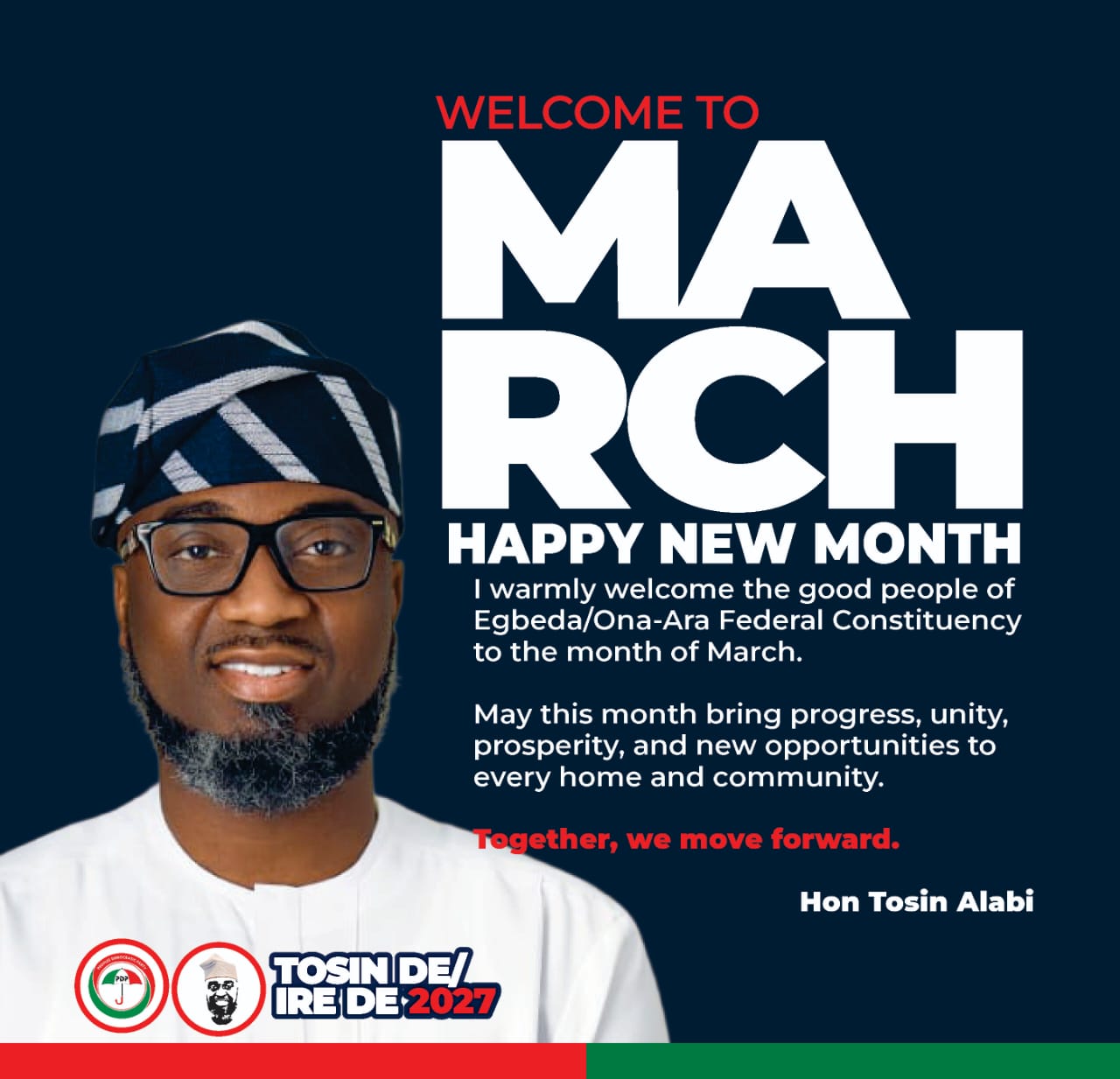 The Egbeda/Ona Ara Federal House of Representatives hopeful, Hon. Tosin Alabi, has warmly welcomed the good people of Egbeda/Ona Ara Federal Constituency into the month of March, expressing optimism for greater progress and prosperity across the constituency.