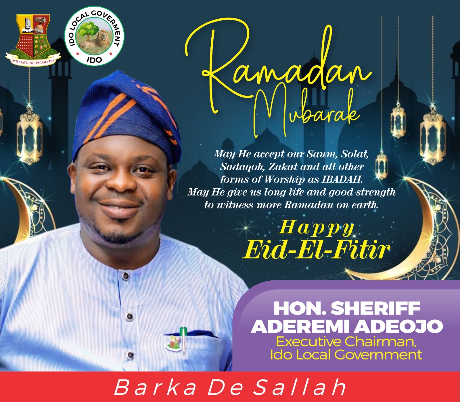 The Executive Chairman of Ido Local Government, Sheriff Aderemi Adeojo, has extended warm felicitations to the Muslim Ummah on the successful completion of the 2026 Ramadan fast, urging residents to uphold the virtues of the holy month for societal growth.