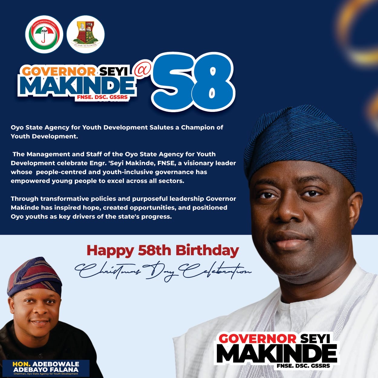 The Oyo State Agency for Youth Development under the leadership of Hon. (Prince) Adebowale Adebayo Falana has joined well-wishers across the state and beyond to felicitate the Executive Governor of Oyo State, His Excellency, Engr. ‘Seyi Makinde on the occasion of his 58th birthday, is described as a visionary leader and a true champion of youth development.