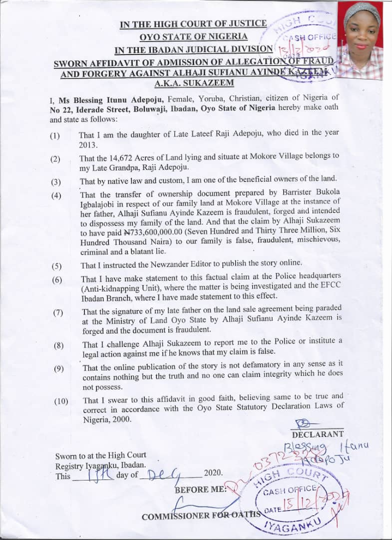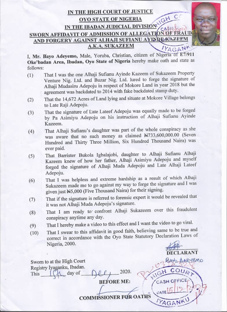 Court affidavit by a daughter of one of the four branches of Adepoju’s family, family-owner of 14,672 acres of land at Mokore village, buttressing the fraudulent action of Sukazeem and his daughter.