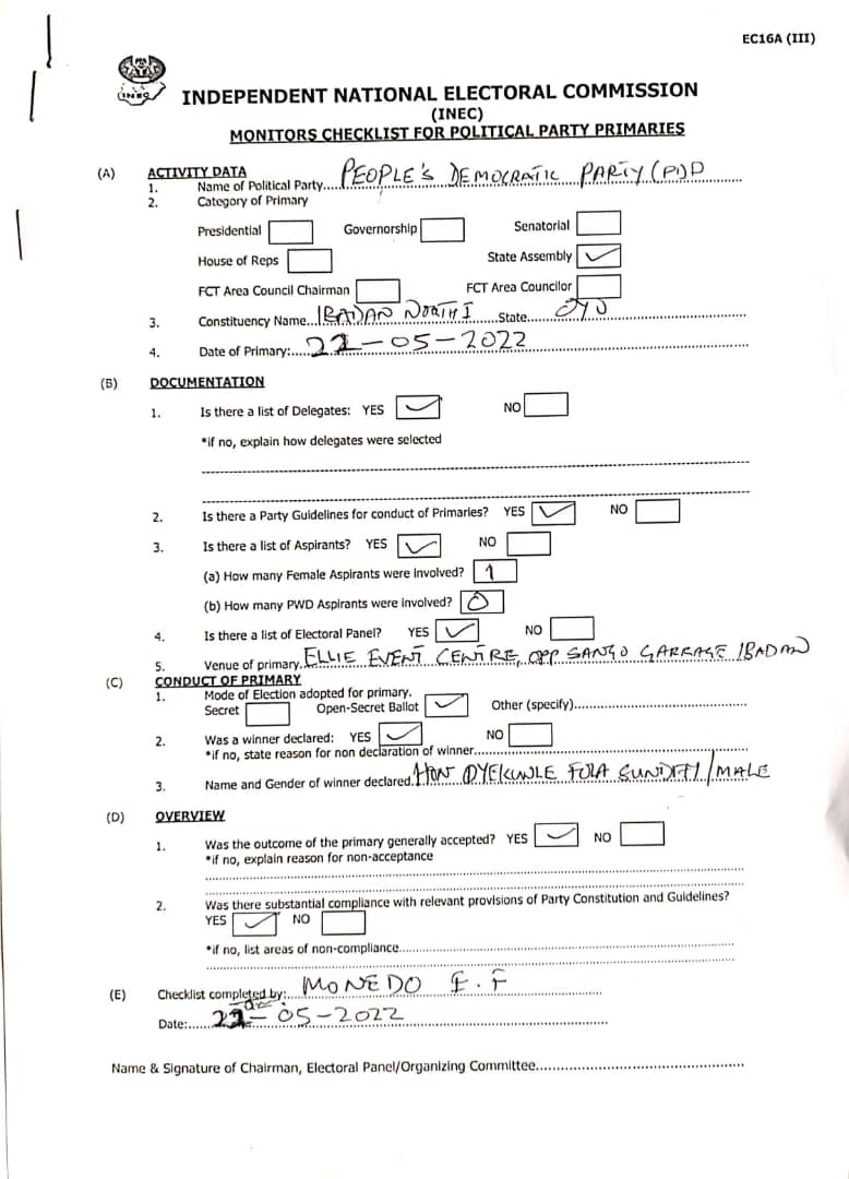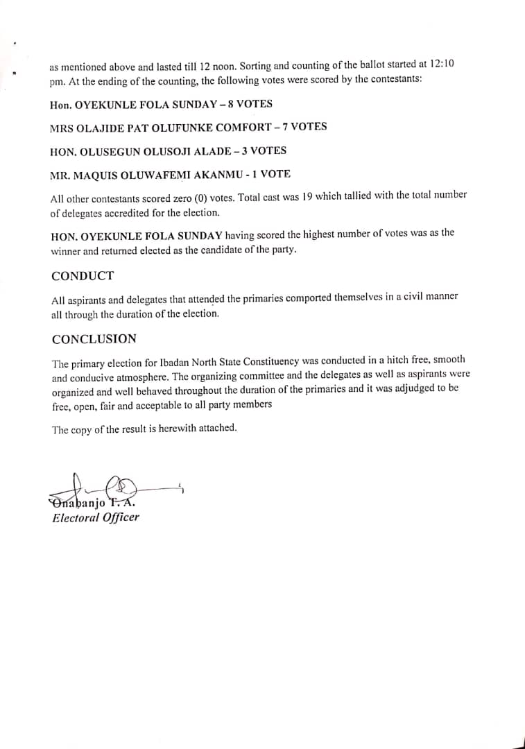 √ Why did INEC who monitored the primary election issue a Certified True Copy of the report in favor of Hon Fola Oyekunle