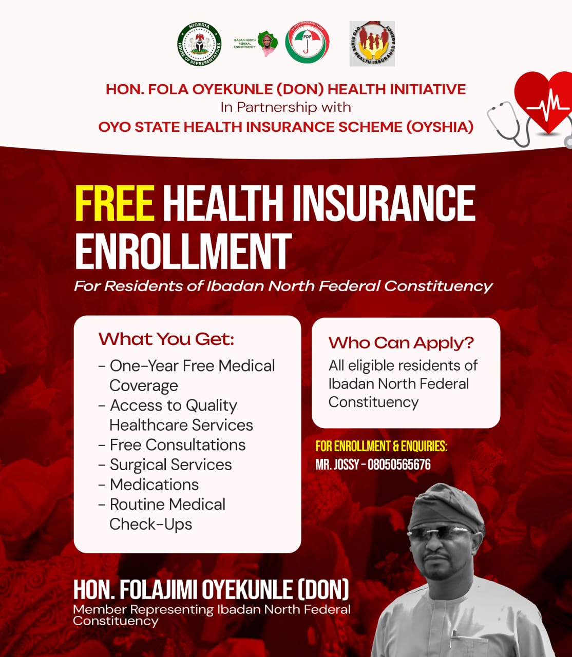 Residents of Ibadan North Federal Constituency have been urged to take advantage of an ongoing free health insurance enrollment facilitated by the lawmaker representing the constituency, Hon. Folajimi Oyekunle (DoN), in partnership with the Oyo State Health Insurance Agency (OSHIA).