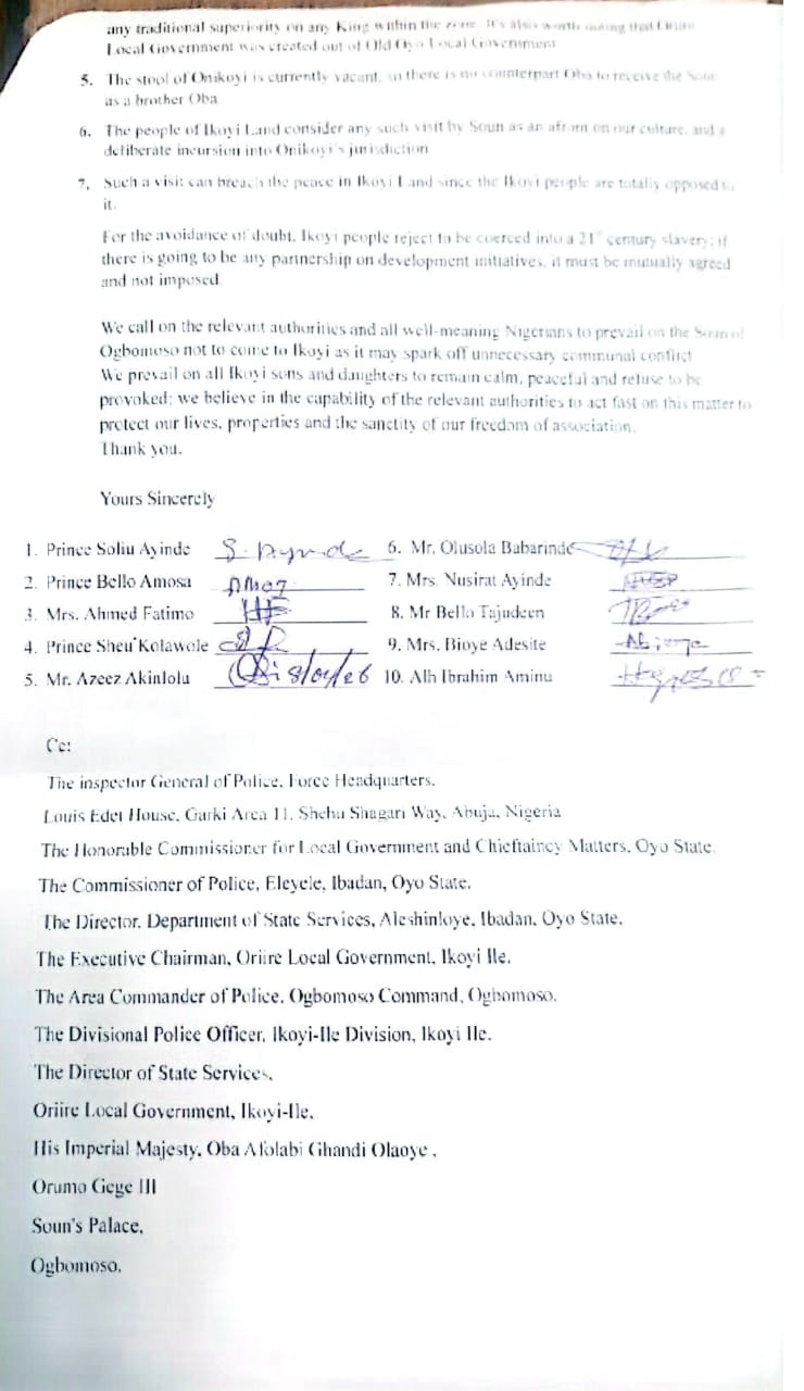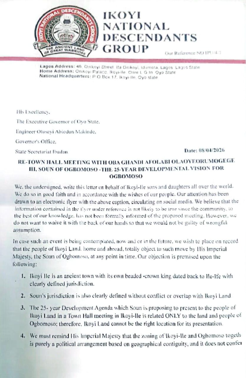 In a statement signed by Prince Soliu Ayinde and other representatives of the community, and issued on behalf of Ikoyi-Ile indigenes at home and in the diaspora, the group expressed concern over an electronic flyer circulating on social media, which announced the planned meeting to be held in Ikoyi Ile. The group noted that it had not received any formal communication regarding the event, raising doubts about its authenticity.