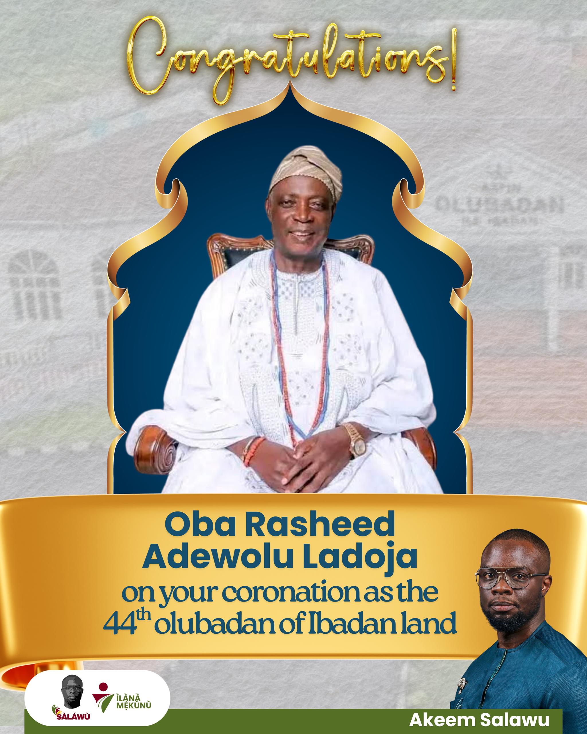 Akeem Salawu has extended heartfelt congratulations to His Imperial Majesty, Oba Rasheed Adewole Ladoja, on his coronation as the 44th Olubadan of Ibadanland, describing the occasion as a moment of pride and great significance for the people of Ibadan.