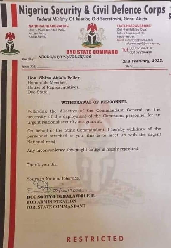 But in a letter to the lawmaker dated February 2, 2022, by the Head of Administration, Oyo State Command, Sotito Igbalawole, the Corps claimed that the withdrawal of the men was necessitated by “the urgent national need.”