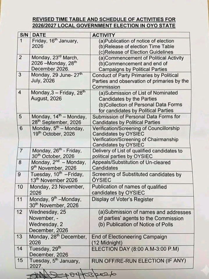 The development, according to the statement dated March 4, 2026, was as a result of the recently revised presidential and national assembly elections by the Independent National Electoral Commission ( INEC) from 20 February,2027 to 16 January, 2027, a date previously scheduled by OYSIEC for the conduct of the local government council elections.