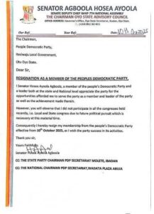 “You will observe that I did not participate in all the congresses recently local and state — due to future political pursuit which is necessary at this material time. Consequently, I hereby resign my membership from the Peoples Democratic Party effective from 10th October 2025, as I wish the party success in its activities.”