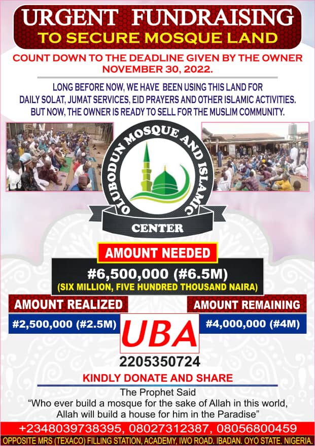 The Mosque, Olubodun Mosque And Islamic Center which is located, Opposite MRS (Texaco) filling Station, Academy Area, Iwo Road, Ibadan, Oyo State, has 10 days as of today, 20th of November, 2022 to raise N4 million to balance 6.5 million of the land price.