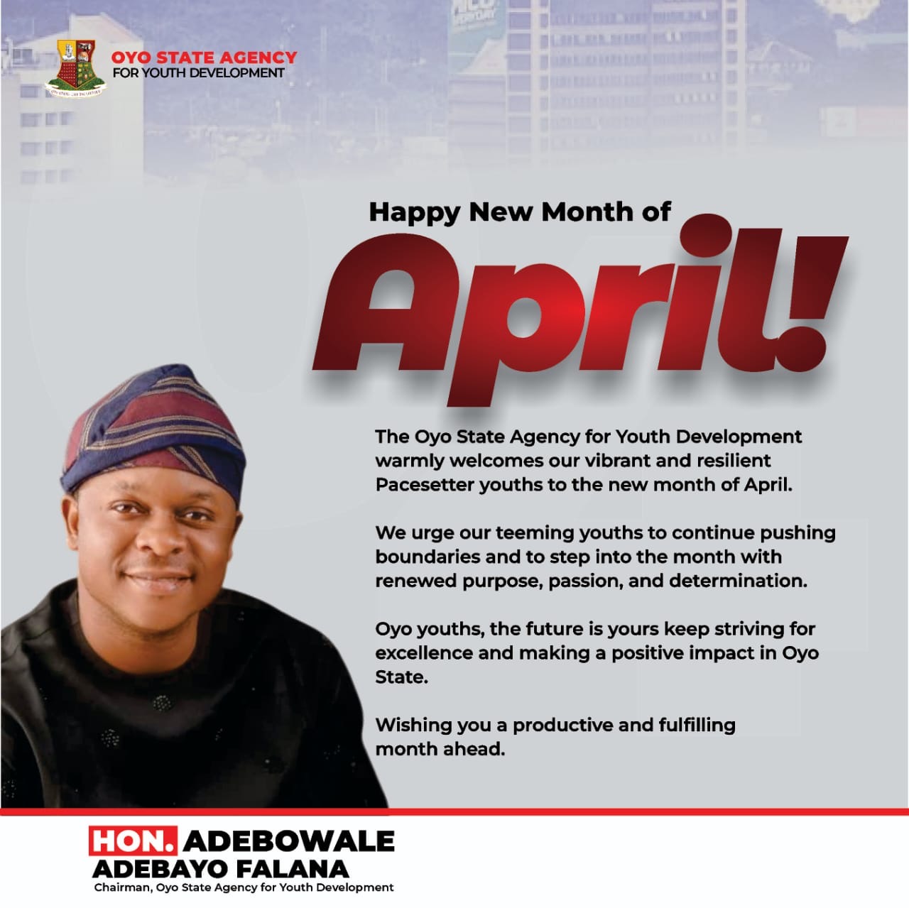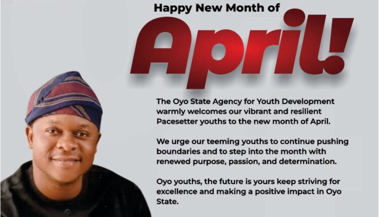 The Oyo State Agency for Youth Development under the chairmanship of Hon. Adebowale Adebayo Falana, has congratulated youths across Oyo State on the commencement of the new month of April, urging them to remain focused and committed to personal growth and societal development.