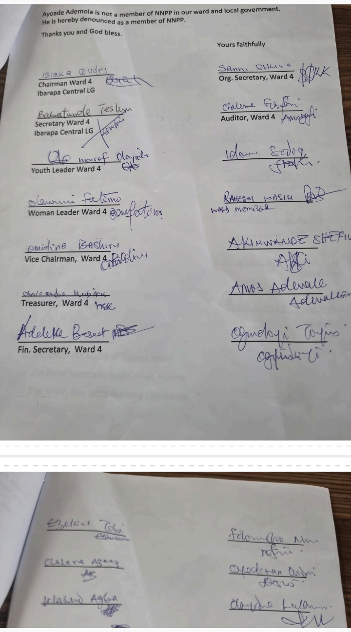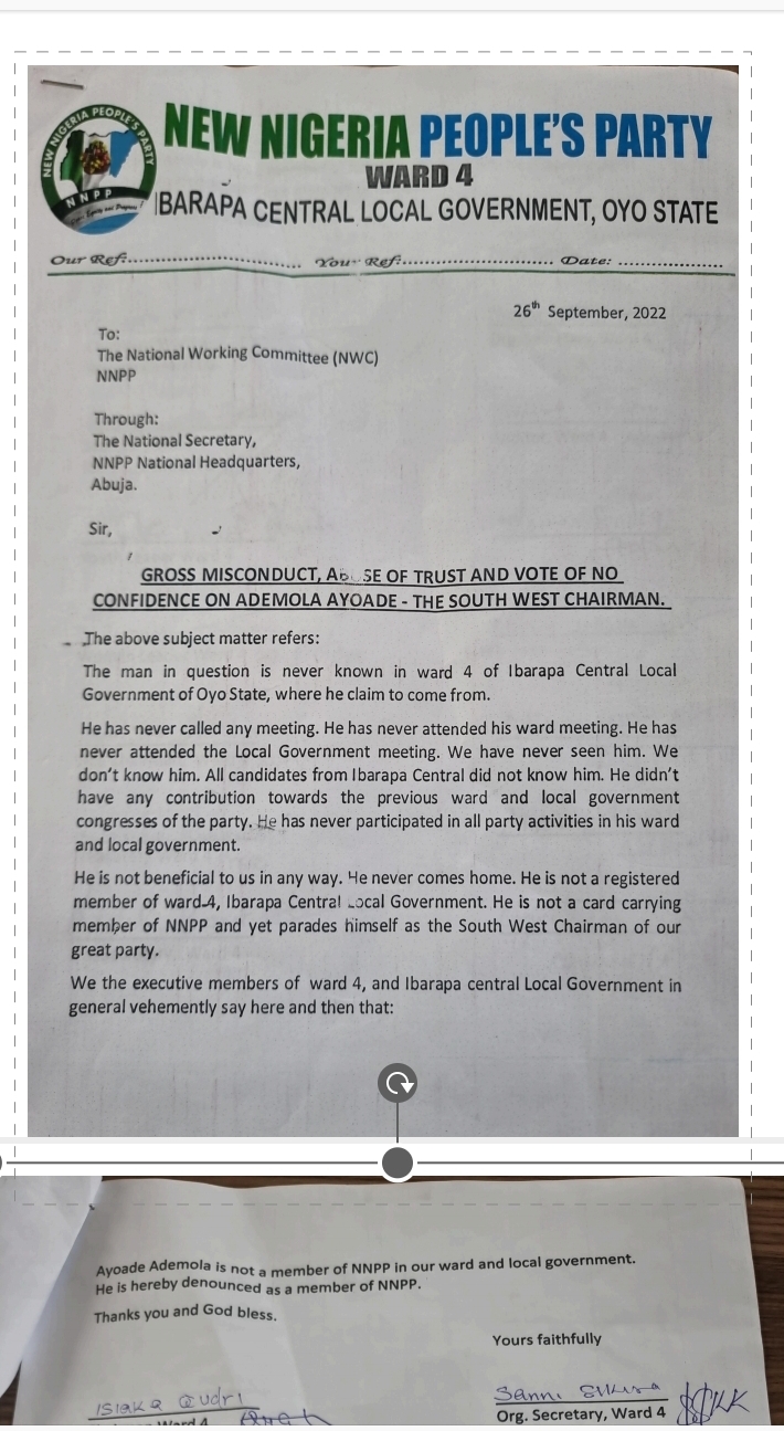 It would be recalled that Ward 4 Executive Council led by the Chairman, Ibarapa centeal Local Government of Oyo state on the 26th of September, 2022 said after making use of all internal dispute mechanisms within our party to call the erstwhile Zonal Chairman Prince Ademola Ayoade to order but all to no avail took a decisive step by Passing Vote of No Confidence on him, the decision that was unanimously agreed and signed by all the Stakeholders including the Ward Executive Officers in the Ward.