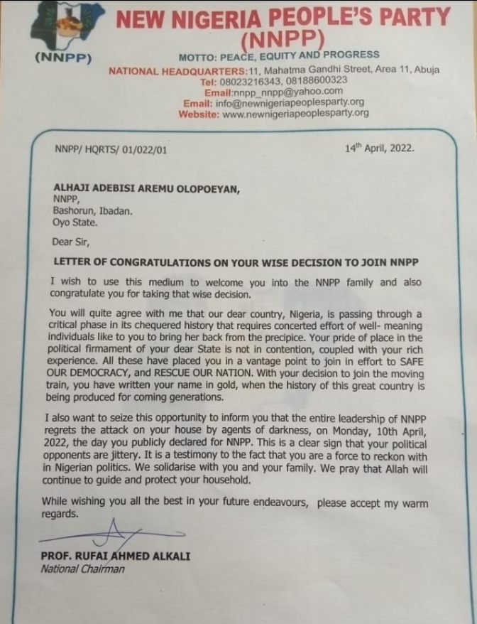 The National Chairman of New Nigeria People’s Party ( NNPP ), Prof. Rufai Ahmed Alkali has emphathised with the southwest leader of the party, Alhaji Adebisi AbdulRasheed Olopoeyan over attack made on his residence in Ibadan last Monday.