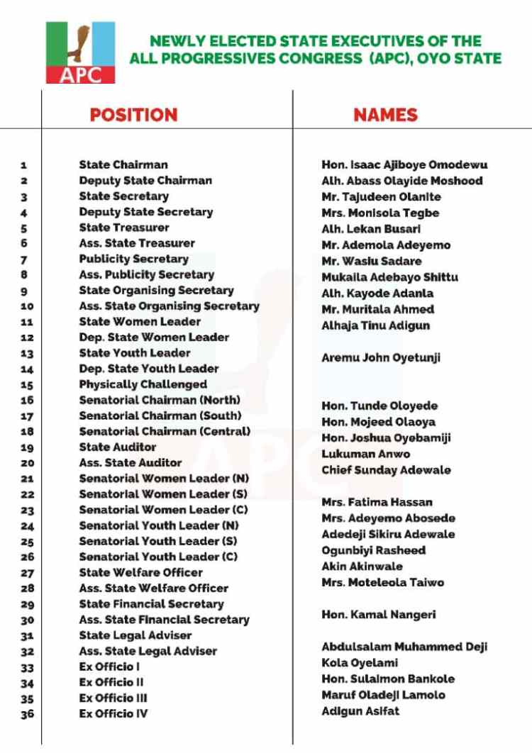 Oyo State All Progress Congress Party ( APC ) has released the names of the elected party executives in just concluded state party congress.