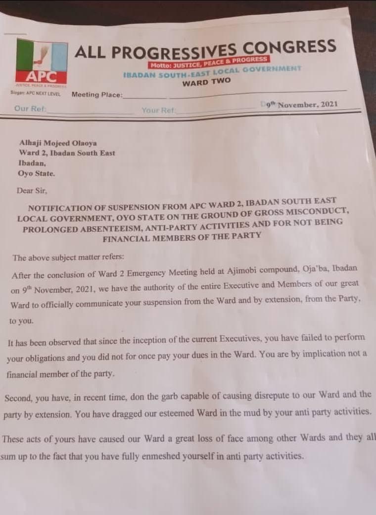 While stating the reasons for Olaoya’s suspension, APC Ibadan South East, Ward 2 accused Alhaji Hon. Mojeed Olaoya of various offenses such as, unacceptable and improper behaviour of a very serious kind, regularly staying away from party meetings without good reason, anti party activities and not been financial member of the party.