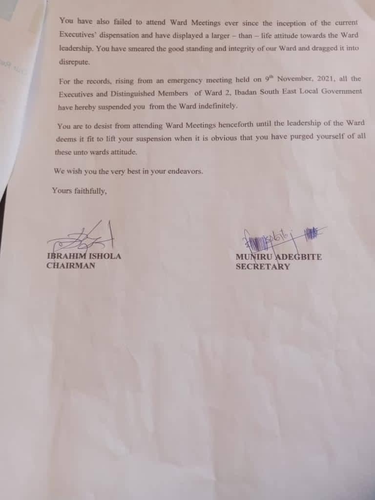For the records, rising from an emergency mecting held on 9h November, 2021, all Executives and Distinguished Members of Ward 2, Ibadan South East Local Government have herby suspended you from the Ward indefinitely.
