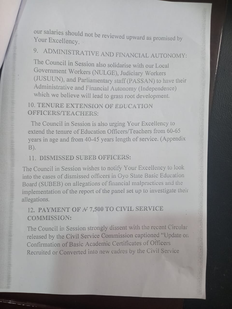 The Council in Session wishes to notify Your Excellency to look into the cases of dismissed officers in Oyo State Basic Education Board (SUBEB) on allegations of financial malpractices and the implementation of the report of the panel set up to investigate their