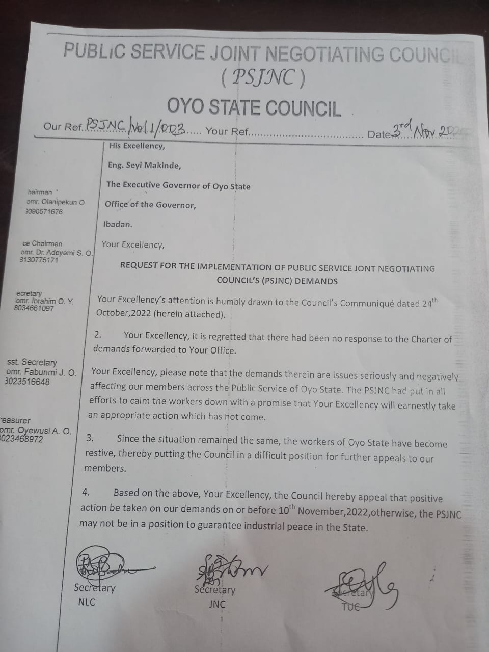 action be taken on our demands on or before 10th November, 2022, otherwise, the PSJNC may not be in a position to guarantee industrial peace in the State.