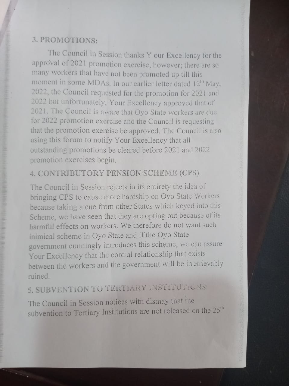 The Council in Session thanks Your Excellency for the approval of 2021 promotion exercise, however; there are so many workers that have not been promoted up till this moment in some MDAs. In our earlier letter dated 12th May, 2022, the Council requested for the promotion for 2021 and 2022 but unfortunately, Your Excellency approved that of 2021. The Council is aware that Oyo State workers are due for 2022 promotion exercise and the Council is requesting that the promotion exercise be approved. The Council is also using this forum to notify Your Excellency that all outstanding promotions be cleared before 2021 and 2022 promotion exercises begin.