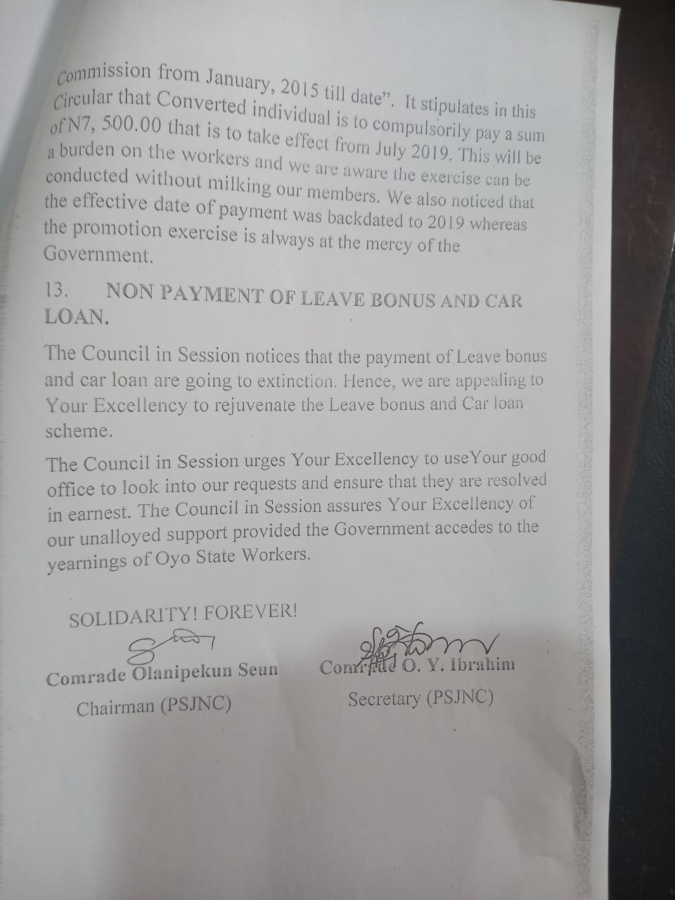 2. Your Excellency, it is regretted that there had been no response to the Charter of demands forwarded to Your Office. Your Excellency, please note that the demands therein are issues seriously and negatively affecting our members across the Public Service of Oyo State. The PSJNC had put in all efforts to calm the workers down with a promise that Your Excellency will earnestly take an appropriate action which has not come.