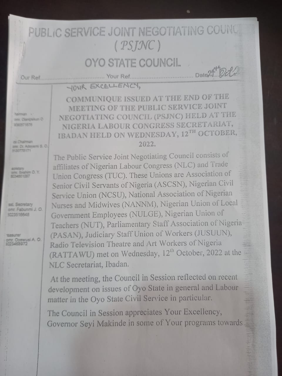 The communique issued at the end of the meeting Of The Public Service Joint Negotiating Council (PSJNC) Wednesday, 12th October, 2022 Read: