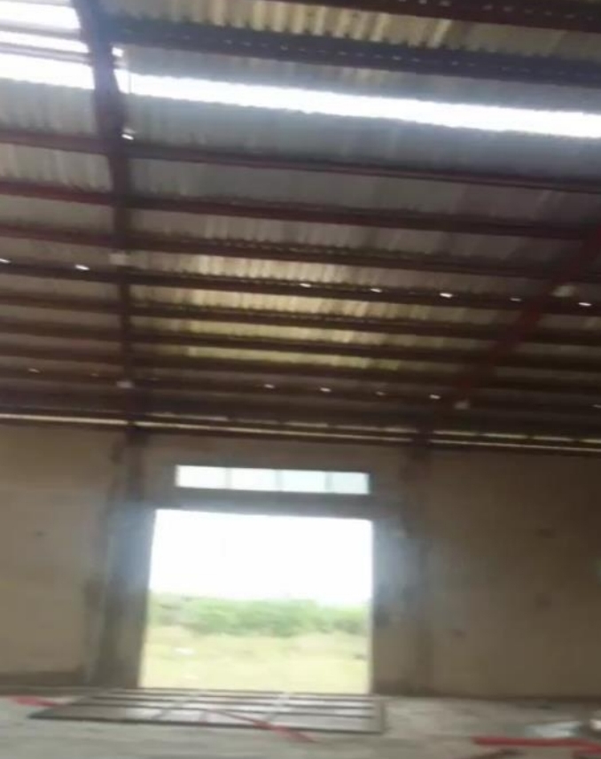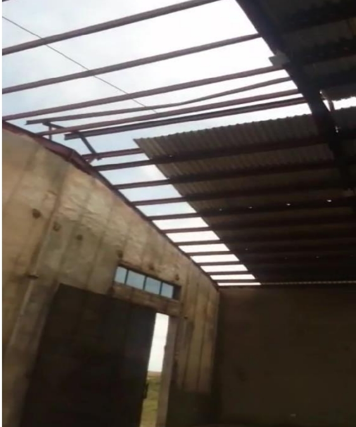Warehouse with roofing sheets gathered from other buildings affected by the storm