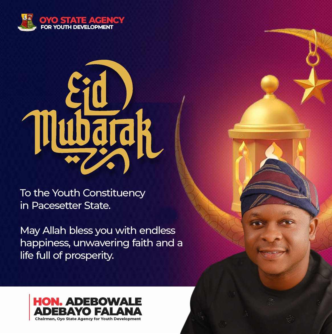 The Oyo State Agency for Youth Development, under the visionary leadership of Hon. Adebowale Adebayo Falana, has extended warm felicitations to Muslim faithful across the state and beyond on the occasion of Eid al-Fitr, marking the successful completion of the holy month of Ramadan.