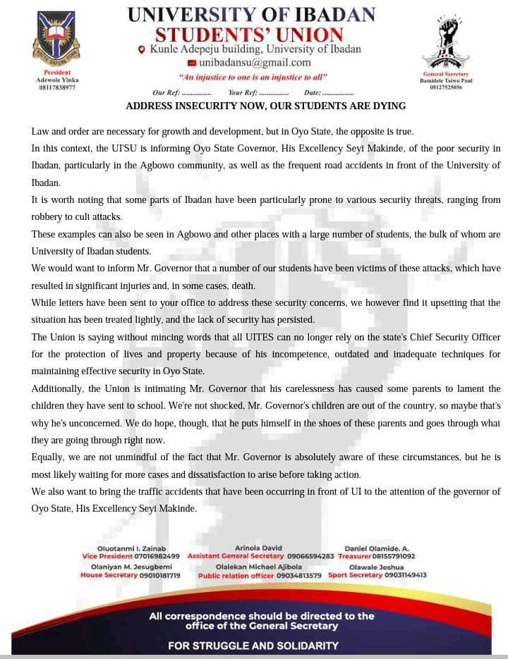 The students’ Union of the University of Ibadan on behalf of the entire students of the institution has urged the Oyo sate governor, Seyi Makinde to liaise with the state security agencies in order to address the poor security challenges in Ibadan, especially those affecting the Agbowo community.