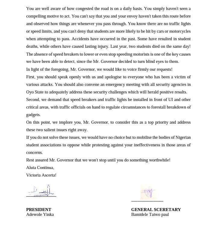 The open letter to governor Makinde which was signed by the Students’ Union President and Secretary, Adewole Yinka and Bamidele Taiwo Paul, the student frown at the governor nonchalant attitude toward frequent road accidents at University of Ibadan entrance, demanded speed breakers and traffic lights be installed in front of the institution and other critical areas that needed.
