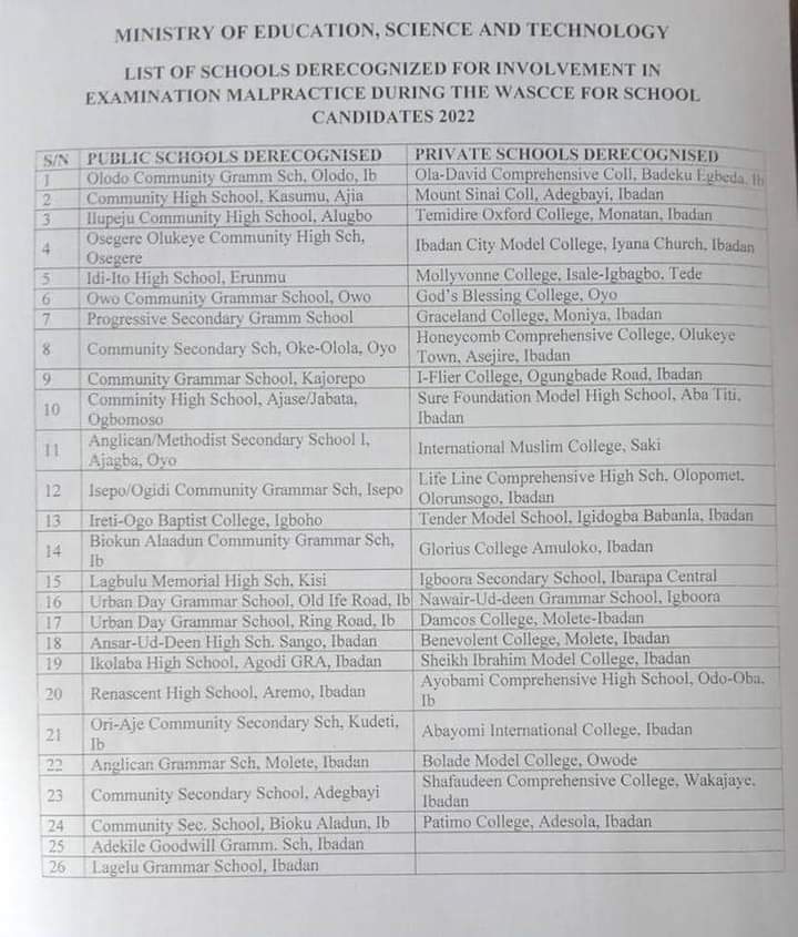 The West African Examinations Council has delisted 50 secondary schools in Oyo State for their involvement in examination malpractice during the 2022 West African Senior School Certificate Examinations.
