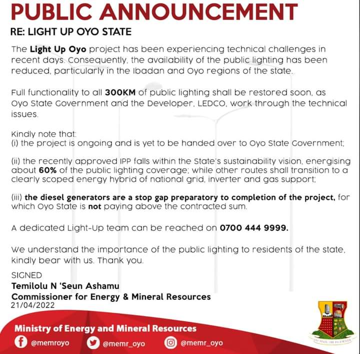 Asamu in a made public announcement said the state government already aware of the nonfunctioning of the errected Streetlights expecially in Ibadan and Oyo cities, assured the residents that the technical issues will be restored soonest.